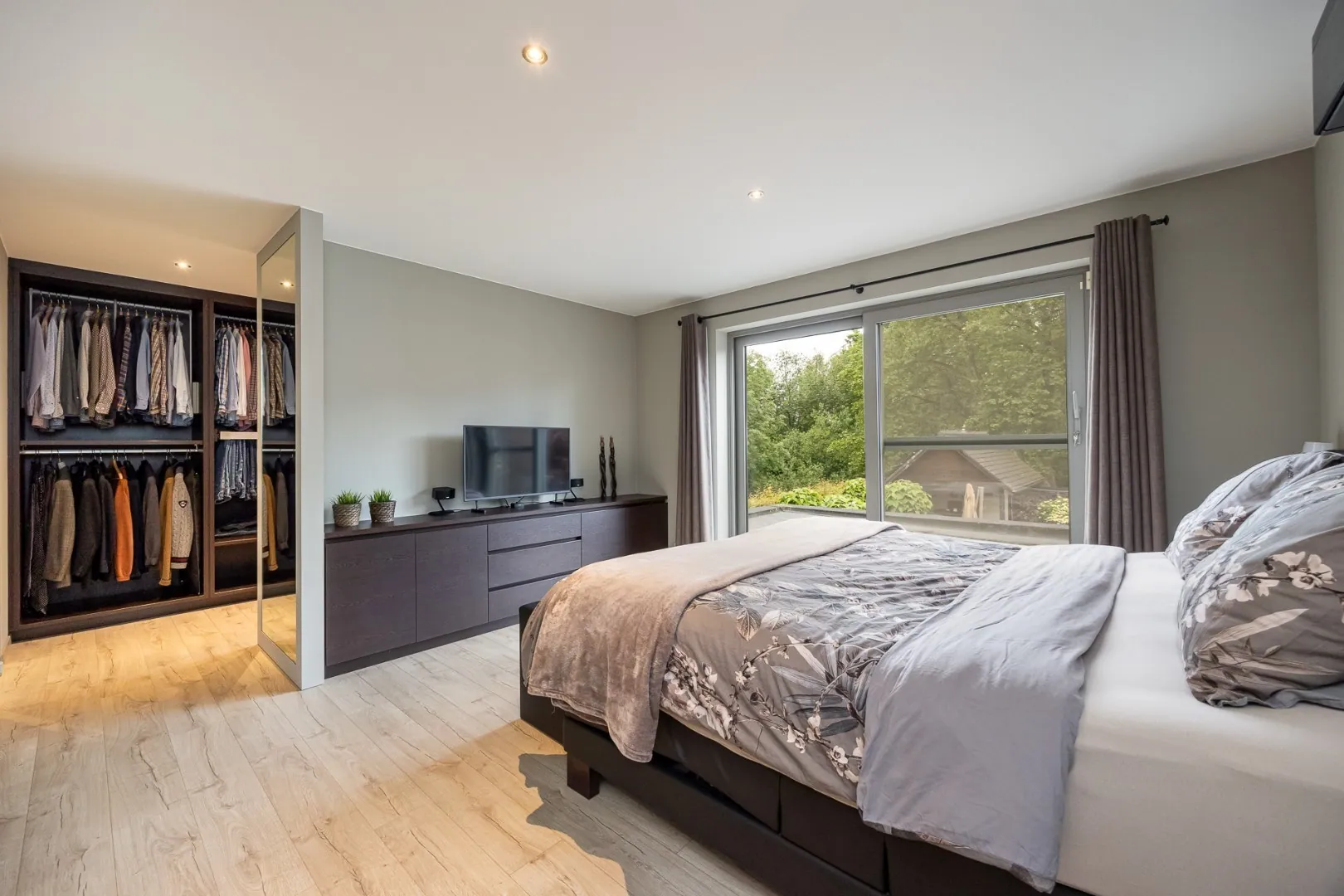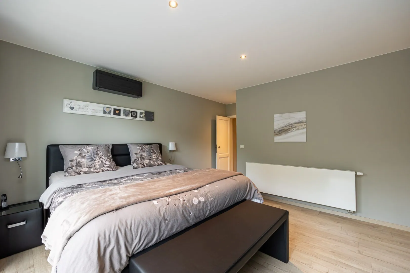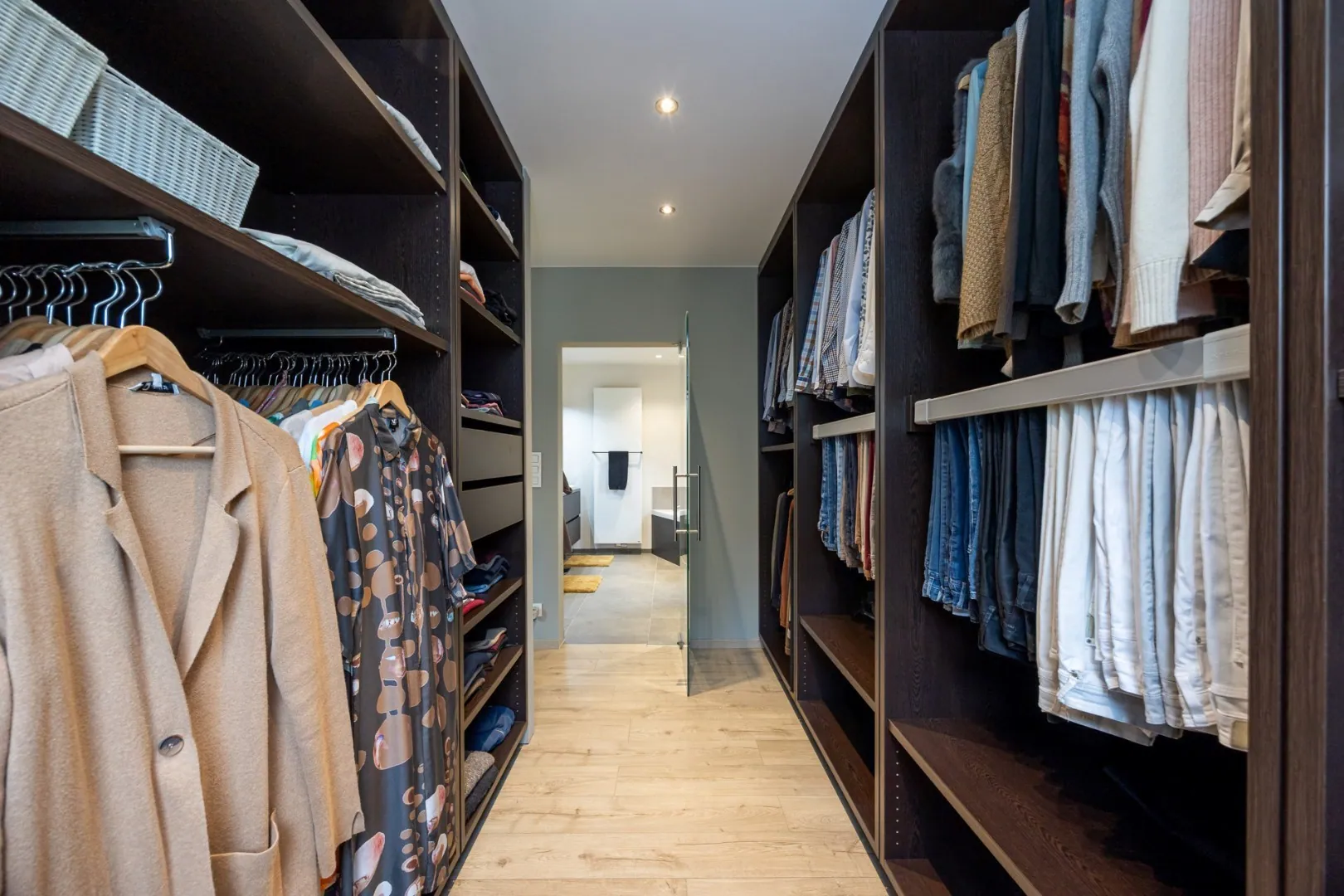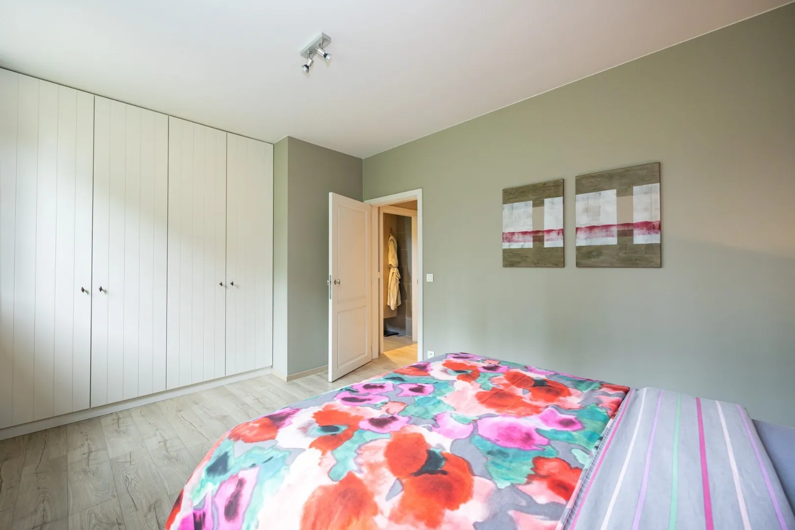 Deze woning beschikt over drie slaapkamers, elk ontworpen met comfort en rust in gedachten. Een ruim en praktisch ingerichte dressing sluit aan bij de Masterbedroom. Verder zijn er twee badkamers, één met douche, de andere met inloopdouche en ligbad.
