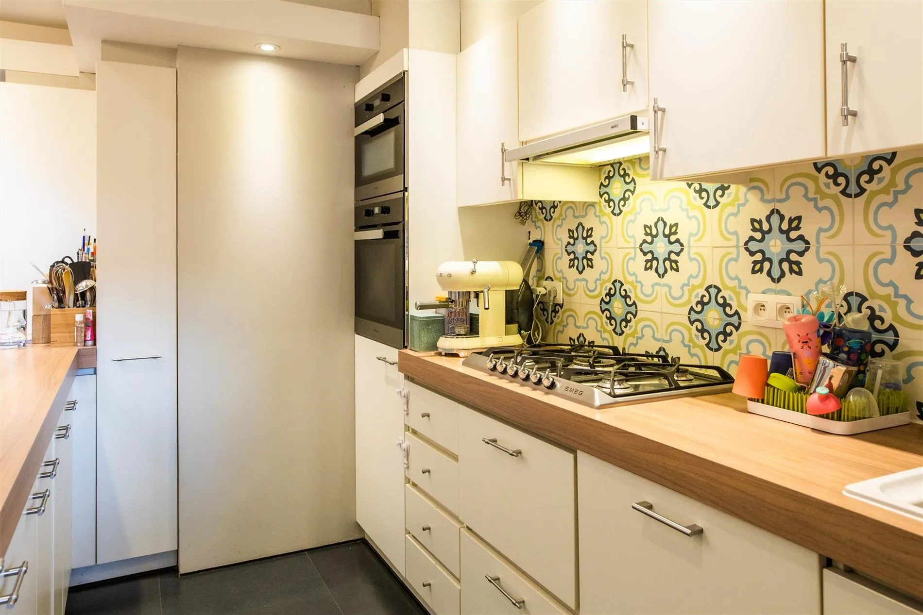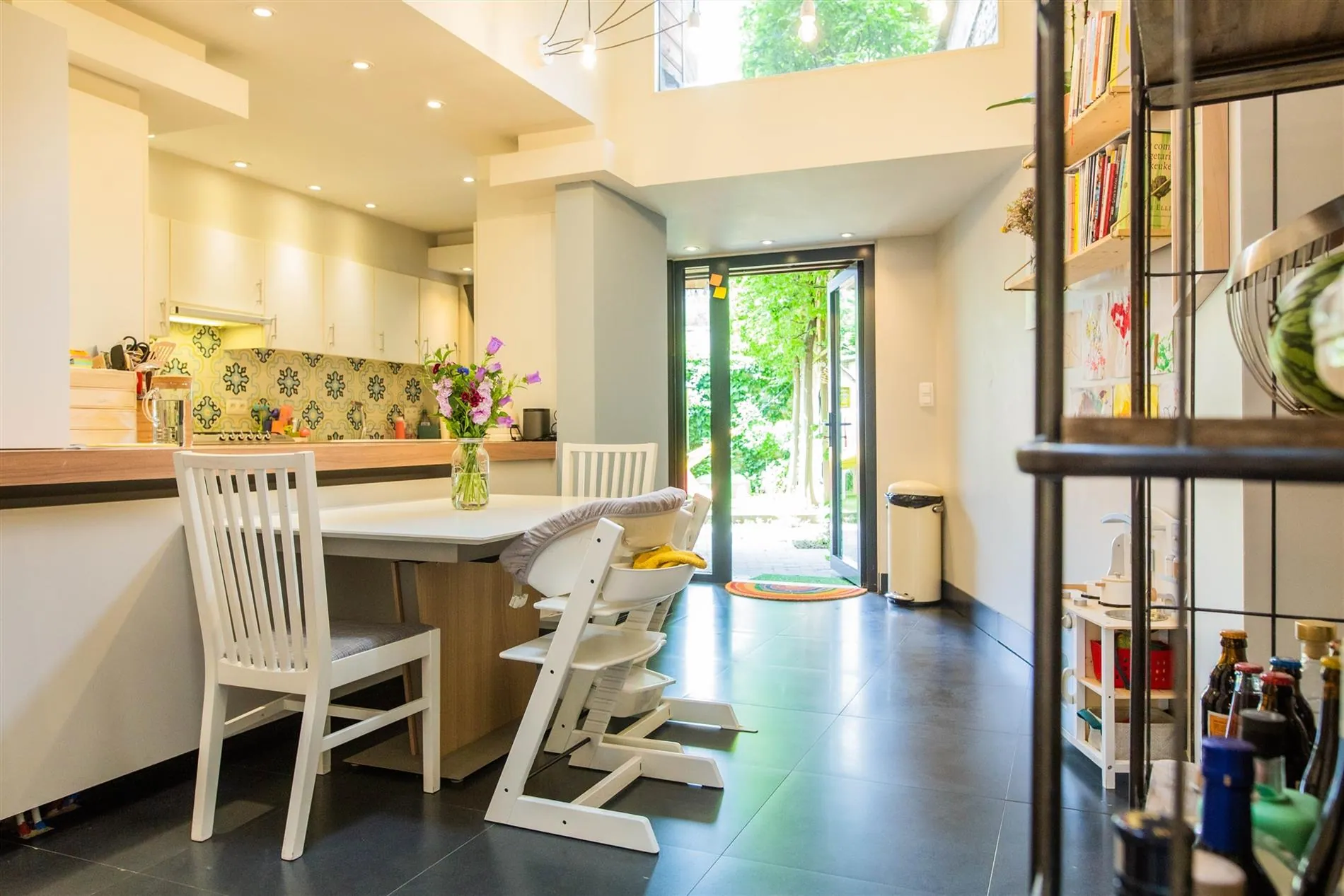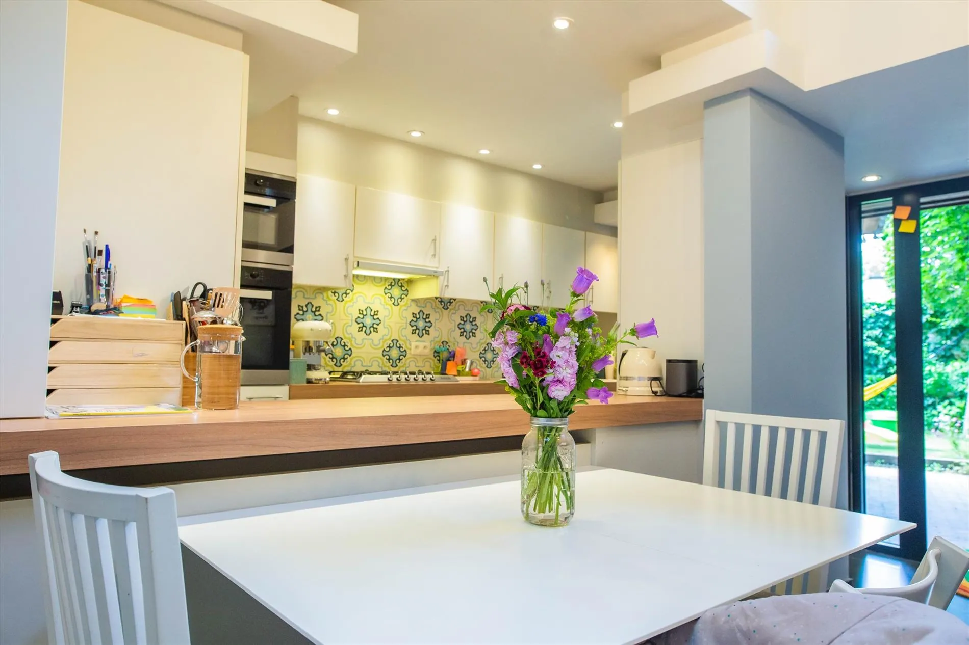 De open en vernieuwde keuken is volledig uitgerust met SMEG gasvuur, AEG vaatwas, Miele oven en microgolfoven, koelkast, diepvries, eiland en veel opbergruimte. Vanuit de keuken heb je zicht en toegang tot de zonnige en groene stadstuin met kunstgras, overdekt terras met terrasverwarmer en mooie aanplantingen.