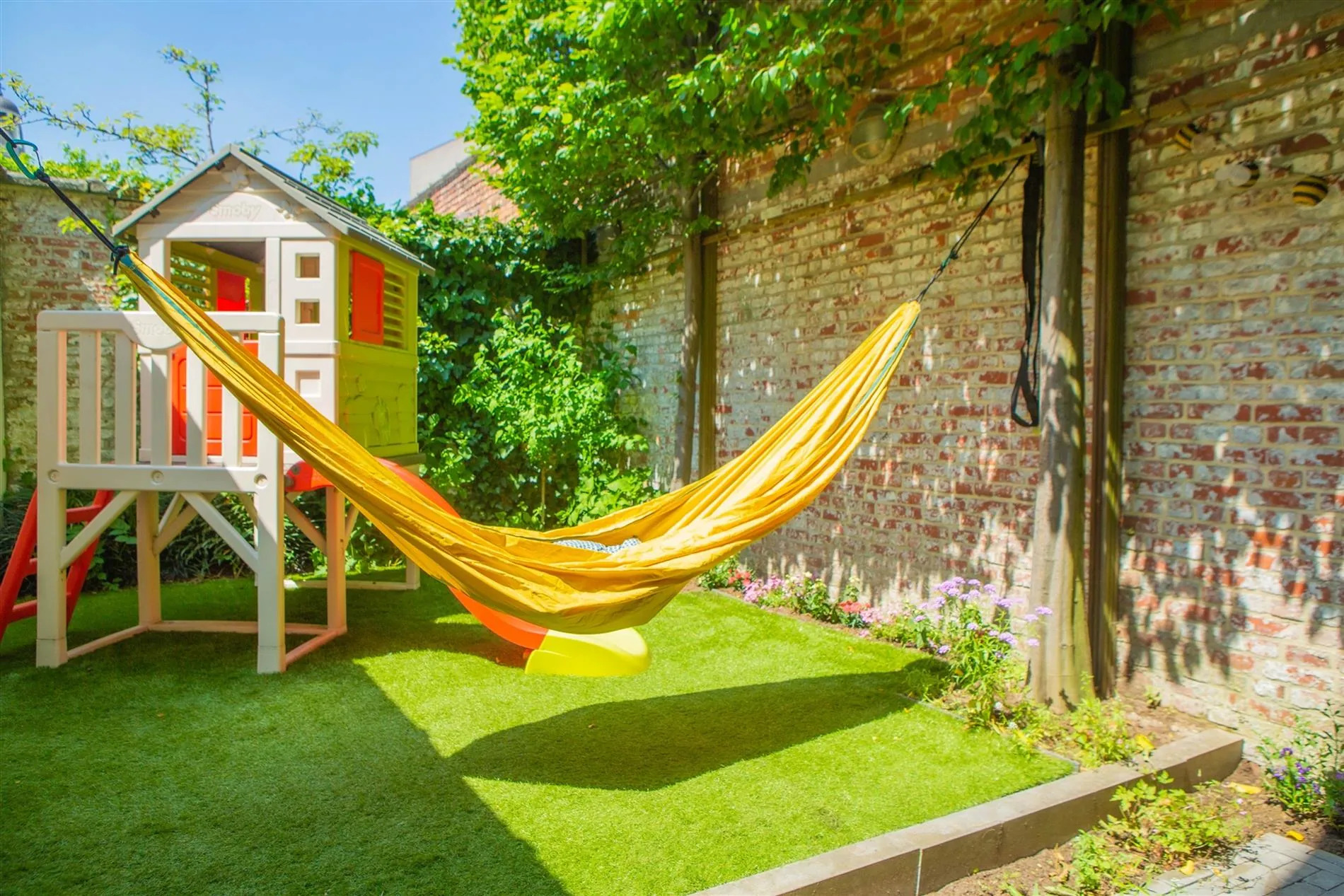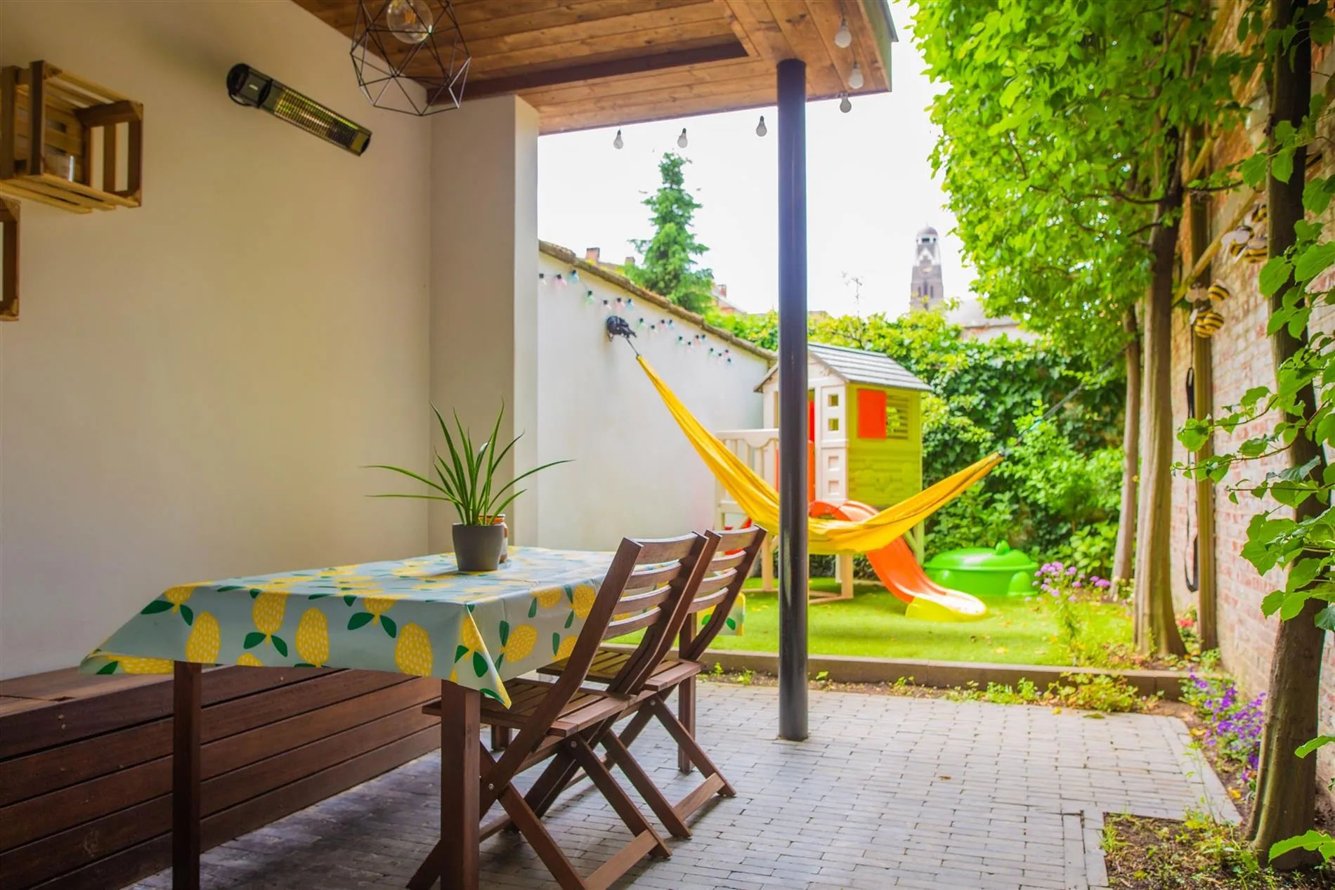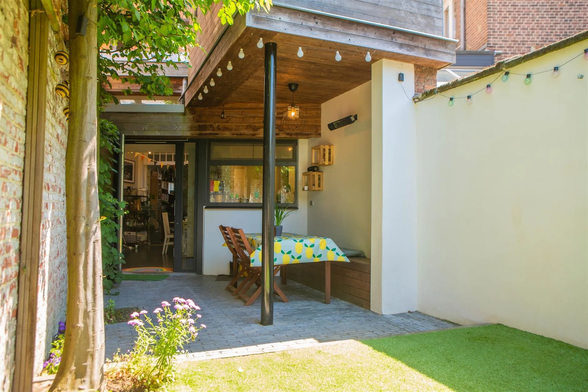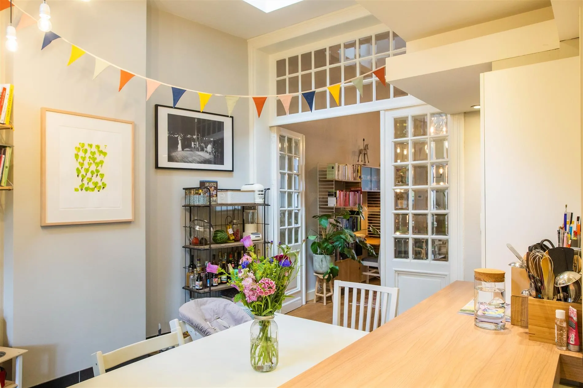 De open en vernieuwde keuken is volledig uitgerust met SMEG gasvuur, AEG vaatwas, Miele oven en microgolfoven, koelkast, diepvries, eiland en veel opbergruimte. Vanuit de keuken heb je zicht en toegang tot de zonnige en groene stadstuin met kunstgras, overdekt terras met terrasverwarmer en mooie aanplantingen.