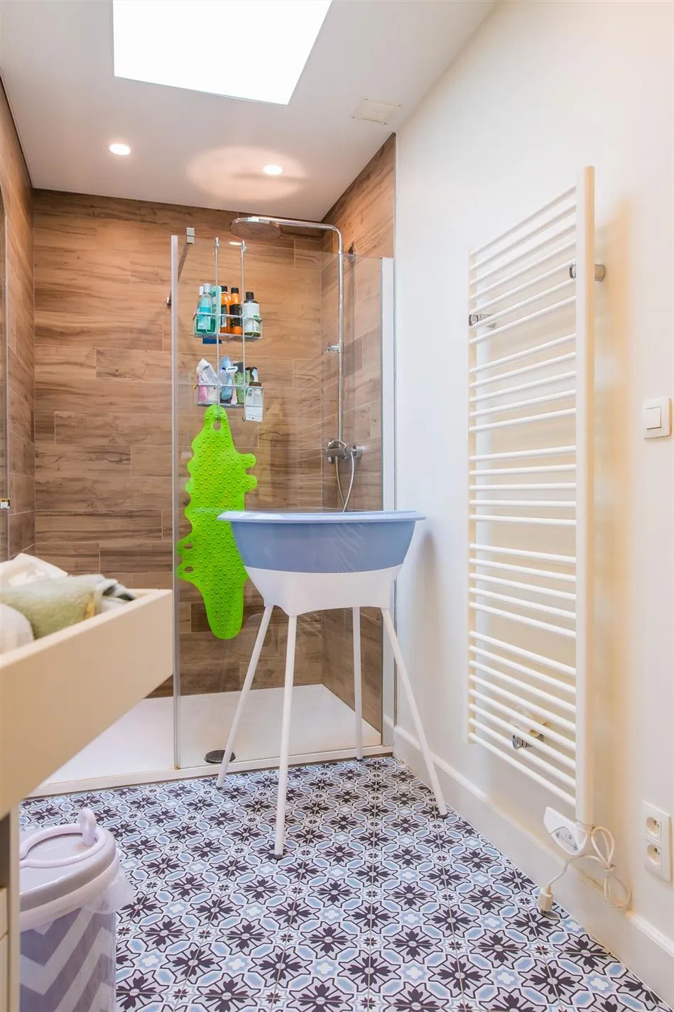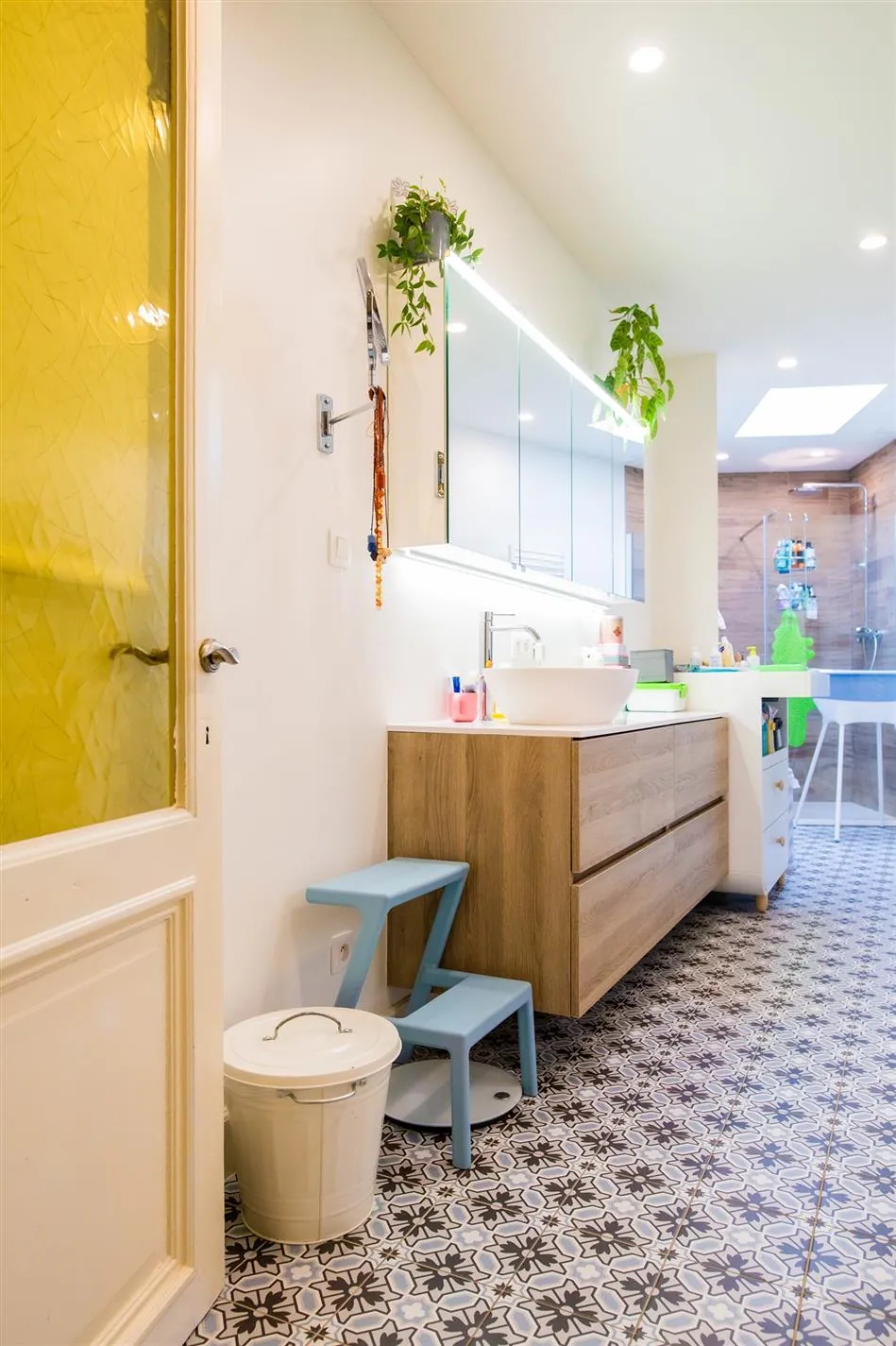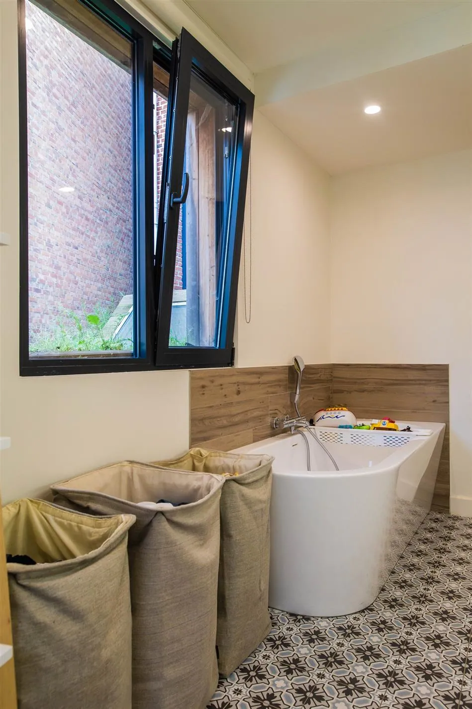 Op het eerste tussenverdiep vind je de volledig gerenoveerde en bijzonder ruime badkamer met lavabo, ligbad, inloopdouche en zicht op het groendak. Aansluitend is een kleine berging met aansluitingen voor was- en droogmachine.