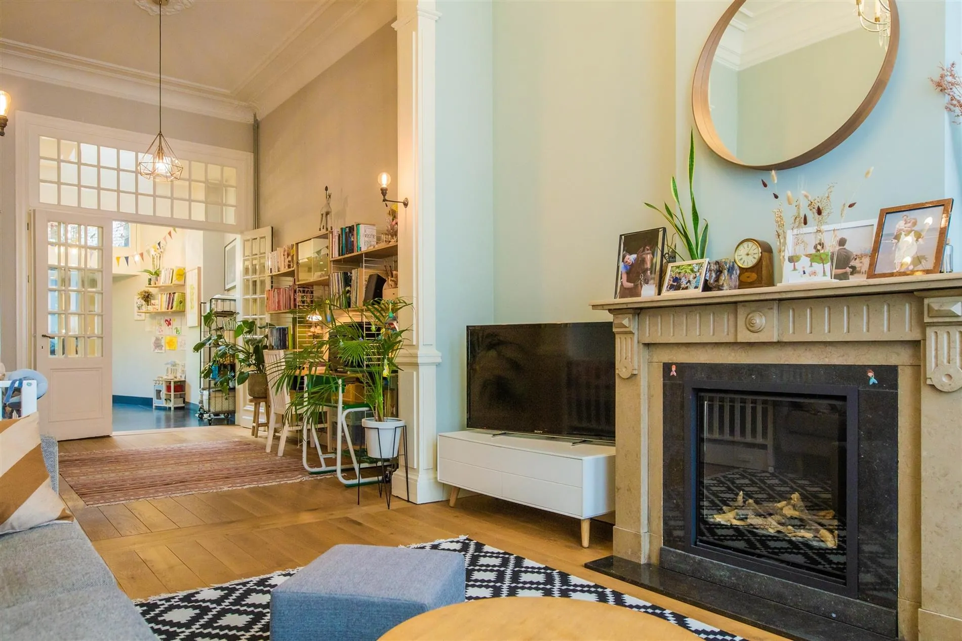 Op het gelijkvloers kom je binnen in de zeer ruime en lichtrijke inkom-/traphal met 4m hoog plafond, eerste gastentoilet, toegang tot kelder, leefruimte en keuken. De statige woonkamer met functionele gashaard en glazen binnendeuren ademt rust, klasse en sfeervol wonen uit.
